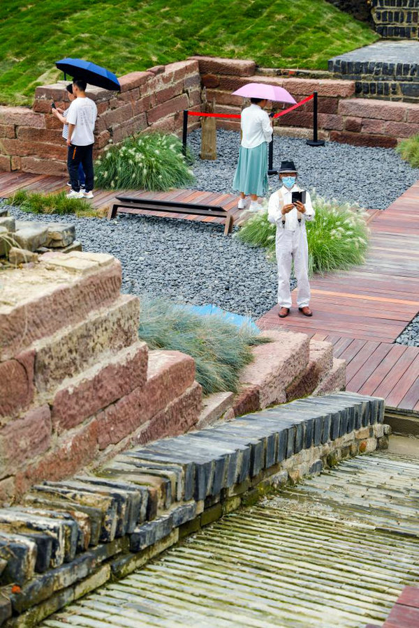 7月20日,在成都東華門遺址公園外場遺址區(qū),人們在參觀原狀展示的水道踏道遺跡。新華社記者 沈伯韓 攝