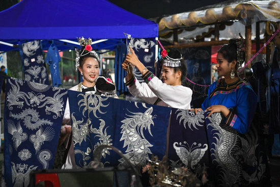 在臺(tái)江縣臺(tái)盤村,“非遺集市”讓游客領(lǐng)略非遺文化之美。目前,全村建成幾十個(gè)固定門面、移動(dòng)攤位、體驗(yàn)中心,給當(dāng)?shù)孛褡迨止に嚻废M(fèi)帶來新的機(jī)遇。在“村BA”球場(chǎng)旁邊的文創(chuàng)產(chǎn)品店內(nèi),村寶寶、66號(hào)籃球服、籃球、鑰匙扣等文創(chuàng)產(chǎn)品銷量大增。