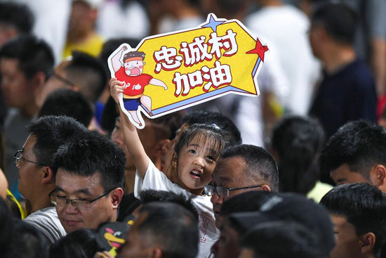 7月29日,一名小朋友在“村超”比賽現(xiàn)場(chǎng)為忠誠村球隊(duì)加油。新華社記者 楊文斌 攝