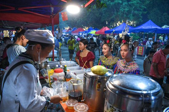 7月1日,游客在貴州“村超”足球賽場(chǎng)附近設(shè)置的免費(fèi)攤位購買地方特色小吃。新華社記者 楊文斌 攝