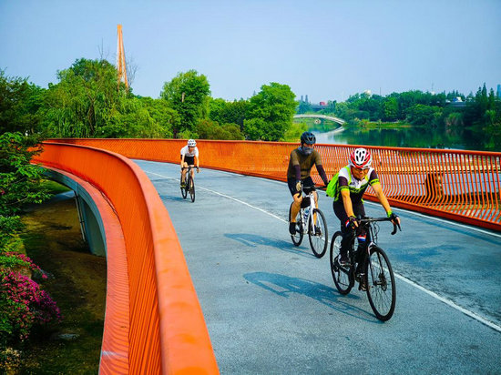 人們在成都錦城湖公園綠道上騎行(6月25日攝)。新華社記者 沈伯韓 攝