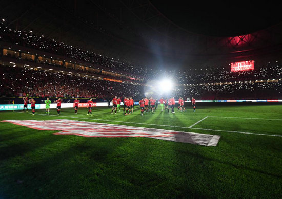 5月23日,成都蓉城隊(duì)球員在賽后向球迷致謝。新華社記者 王曦 攝