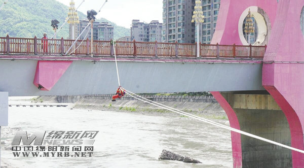 水域救援往往和山岳救援中用到的單繩橫渡繩索方式同步進行。當天的訓練現(xiàn)場,消防救援人員先將救生引繩用無人機拉向河對岸,并返回用引繩將主索拉繩索固定好,然后沿繩索滑向河對岸,利用扁帶制作簡易安全帶將被困人員營救過河。