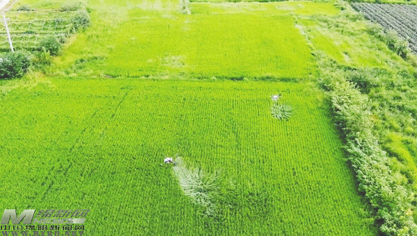 綿陽(yáng)新聞網(wǎng)訊 近日,在游仙區(qū)忠興鎮(zhèn)興合村,一片片綠油油的水稻散發(fā)著蓬勃生機(jī)。伴隨著旋翼轟鳴聲,兩架植保無(wú)人機(jī)在技術(shù)人員的操作下騰空而起,沿著稻田勻速飛行,機(jī)身下噴出的白色霧化藥物均勻?yàn)⑾虻咎?,為田間水稻披上了一層“防護(hù)外衣”(如圖)。