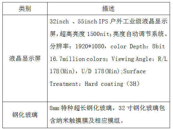 本次維修針對(duì)戶外多媒體閱報(bào)欄(一期)無(wú)法正常使用的32寸、55寸液晶顯示屏及損傷鋼化玻璃實(shí)施維修更換,需供應(yīng)商準(zhǔn)確查明故障原因,并快速高效維修。維修后的運(yùn)行效果要求與閱報(bào)欄相應(yīng)設(shè)備保持一致。維修后的質(zhì)量保證期不低于3個(gè)月。設(shè)備相關(guān)參數(shù)如下: