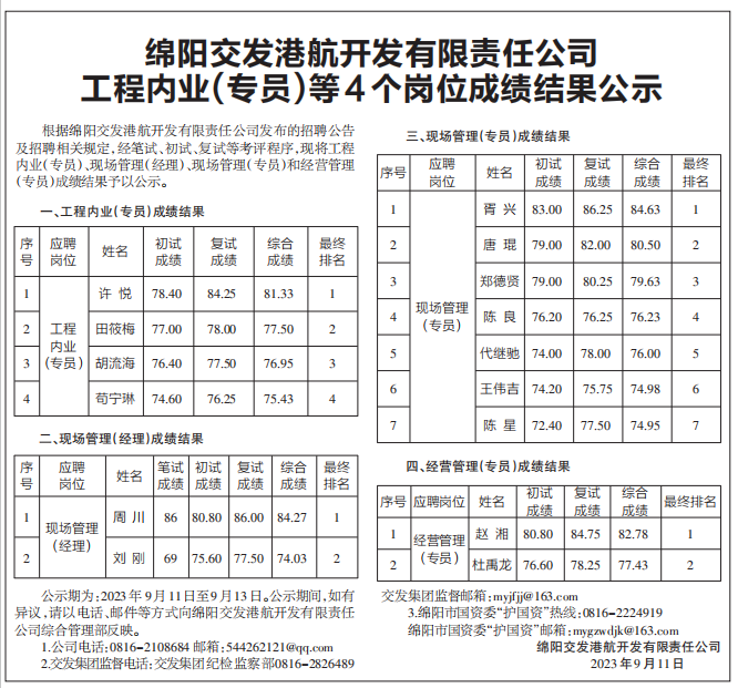 綿陽交發(fā)港航開發(fā)有限責(zé)任公司工程內(nèi)業(yè)(專員)等4個崗位成績結(jié)果公示