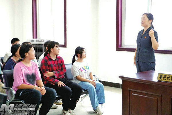 為了讓同學(xué)們了解法院工作,蘆溪法庭主動(dòng)邀請(qǐng)同學(xué)走進(jìn)法庭參觀。同學(xué)們體驗(yàn)了安檢流程,參觀了訴訟服務(wù)大廳、家事審判庭、科技法庭、溫馨調(diào)解室等區(qū)域,了解了法庭工作日常、訴訟服務(wù)中心設(shè)施功能、立案流程以及相關(guān)便民服務(wù)舉措等,實(shí)地感受到“智慧法院”的“智慧”和法律的莊嚴(yán)。法官還向同學(xué)們講解了法官、書(shū)記員、原告、被告等席位和職責(zé)以及法槌、法徽的象征意義。在對(duì)審判工作有了更加直觀的了解后,同學(xué)們有序“換裝”,坐到不同席位上,沉浸式融入“法官”“書(shū)記員”等角色,通過(guò)體驗(yàn)開(kāi)庭中的各個(gè)環(huán)節(jié),進(jìn)一步增加了對(duì)法律的敬畏感。