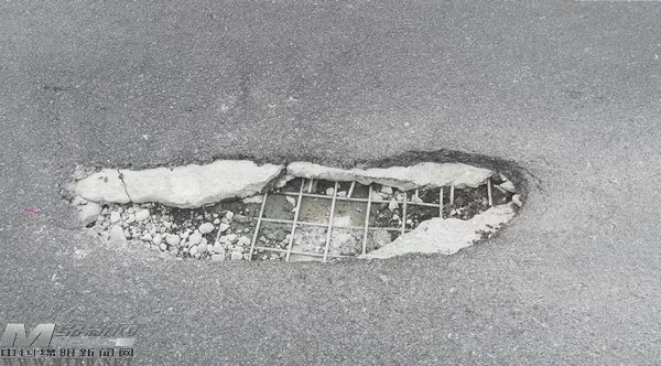 往石馬方向再前行幾十米,在中間車道和最外側(cè)車道,記者陸續(xù)發(fā)現(xiàn)大小不等的三處坑洞。有的坑洞地面水泥瀝青已經(jīng)不在,能清晰看到混凝土下面的水泥和最下層的鋼筋。很多車輛走到這里突然發(fā)現(xiàn)路面破損,只好減速,小心翼翼開過去。一些來不及變道的大貨車,只有硬著頭皮從坑洞邊上碾過去,發(fā)出“砰砰”巨大聲響,整個車身都在抖動。