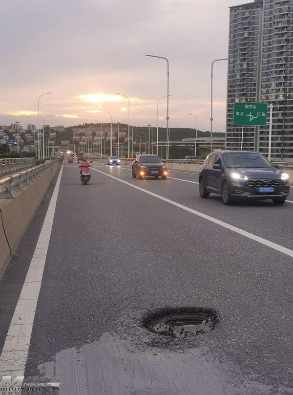 “你看,這個地方是上橋方向,車輛都在加速,開到面前才發(fā)現(xiàn)這個大坑,很多司機(jī)慌忙并線避讓,由于橋面上是實線,不能輕易變道,這就帶來一連串的安全隱患。”謝師傅說。