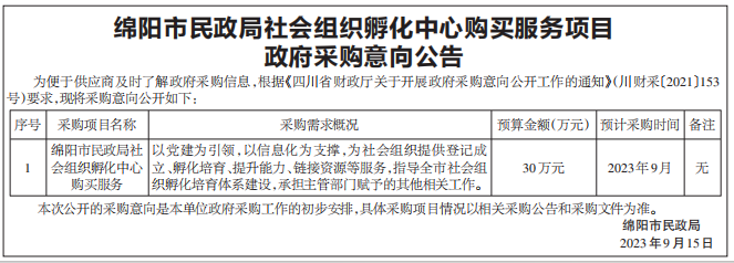 綿陽(yáng)市民政局社會(huì)組織孵化中心購(gòu)買(mǎi)服務(wù)項(xiàng)目政府采購(gòu)意向公告