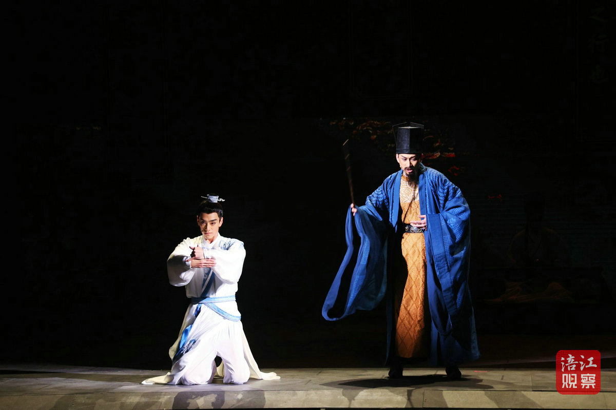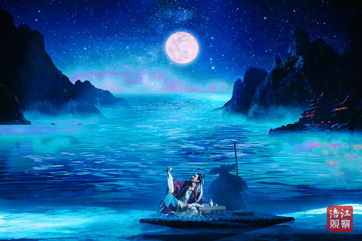 當(dāng)天19時(shí)30分,李白的人生故事隨著音樂聲啟幕。在四川綿陽的江油青蓮鎮(zhèn),李白在家鄉(xiāng)的自然山水間盡情釋放才情,恣意表達(dá)自己放蕩不羈的生活方式。在親人和朋友的支持、鼓勵(lì)下,他為國辭鄉(xiāng)出蜀,最終成為一代“詩仙”。