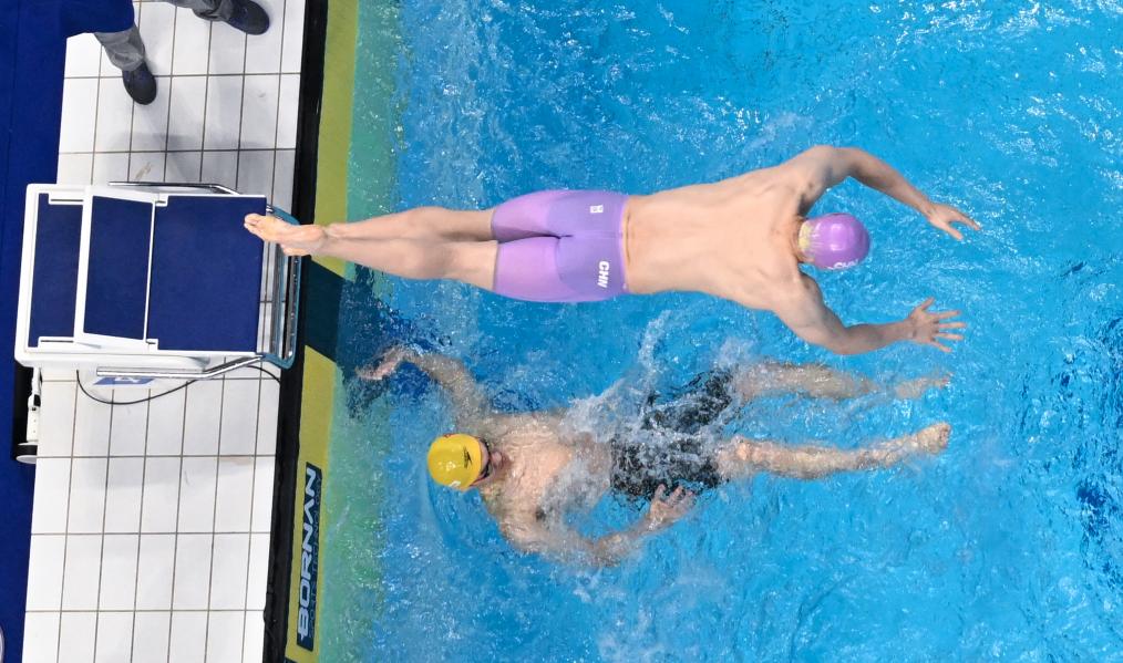 9月26日,中國隊第一棒選手徐嘉余(下)與第二棒選手覃海洋接力。新華社記者 黃宗治 攝