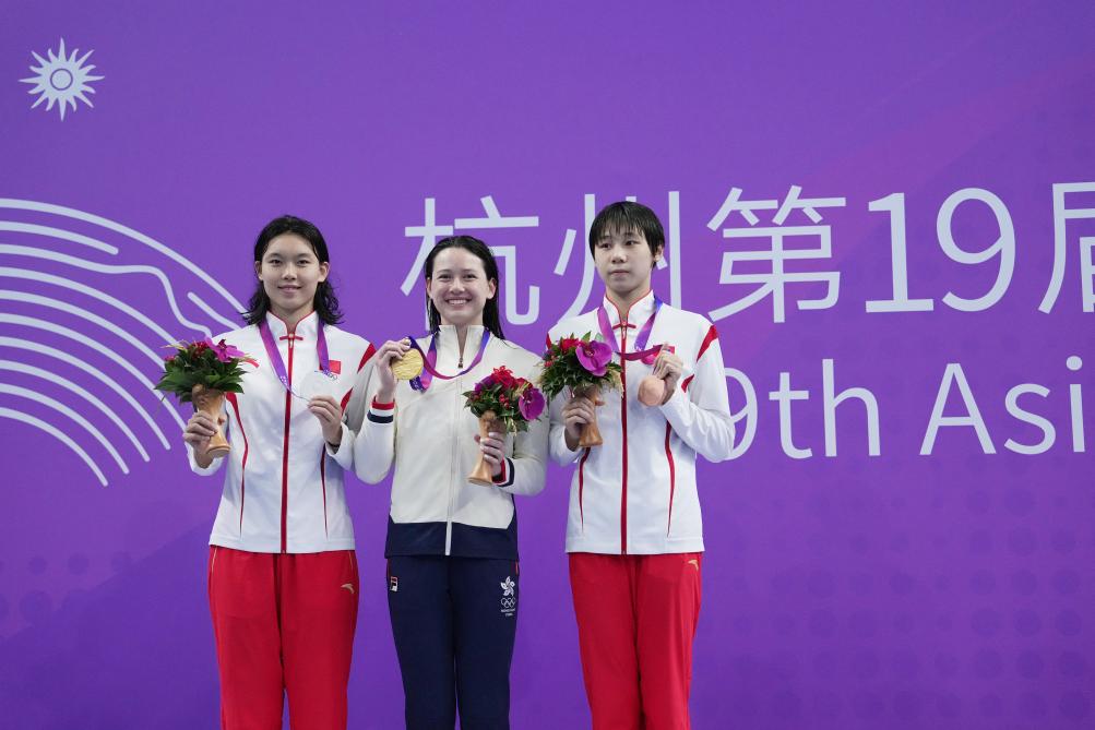 繼奪得中國香港隊歷史上首枚亞運(yùn)游泳金牌后,何詩蓓在女子100米自由泳比賽中一馬當(dāng)先,以52秒17打破亞洲紀(jì)錄,并摘得個人在杭州亞運(yùn)會上的第二枚金牌,中國選手楊?,u和程玉潔分獲銀牌和銅牌。
