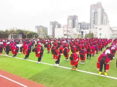 另一邊,在綿陽市萬達(dá)學(xué)校的大課間時(shí)段,同學(xué)們在洪亮的“嘿”“哈”聲中,伸臂、踢腿、揮拳、轉(zhuǎn)身,武術(shù)操一招一式剛勁有力,充分展現(xiàn)出力與美。