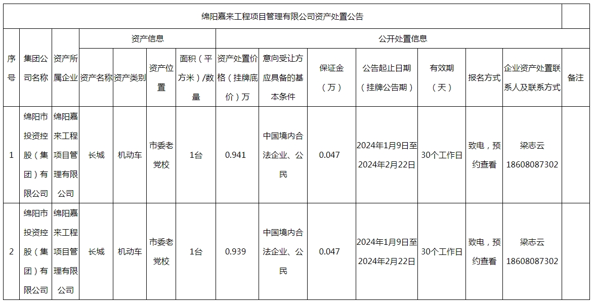 綿陽(yáng)嘉來(lái)工程項(xiàng)目管理有限公司資產(chǎn)處置公告