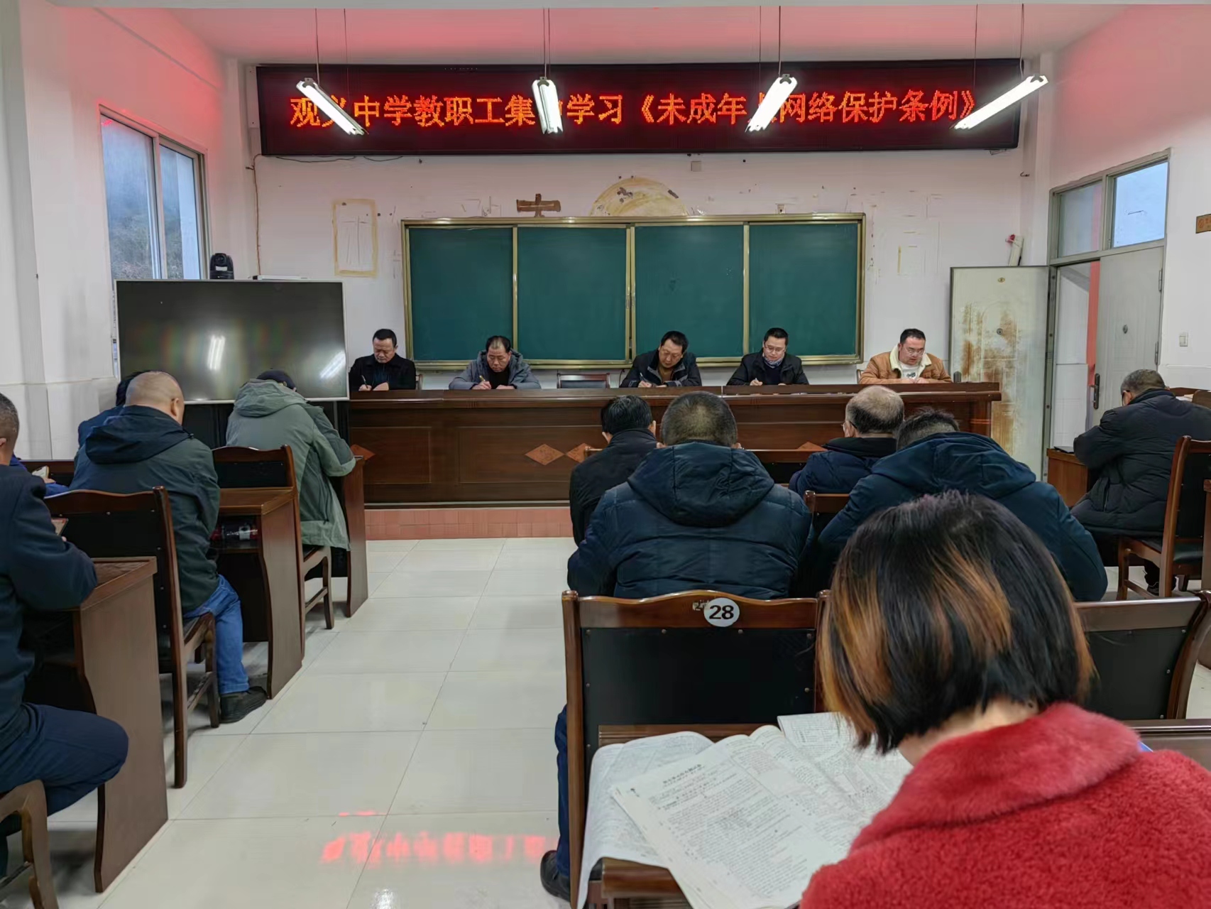 為了廣泛宣傳《未成年人網(wǎng)絡(luò)保護(hù)條例》,進(jìn)一步凝聚未成年人網(wǎng)絡(luò)保護(hù)工作共識(shí),為未成年人健康成長(zhǎng)營(yíng)造更加風(fēng)清氣正的網(wǎng)絡(luò)空間,2023年12月起,梓潼縣觀義中學(xué)通過(guò)行政會(huì)、教師會(huì)、全校師生大會(huì)等,集中開(kāi)展了以“與法同行、守護(hù)成長(zhǎng)”為主題的學(xué)習(xí)《未成年人網(wǎng)絡(luò)保護(hù)條例》的相關(guān)內(nèi)容。