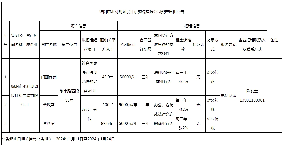 綿陽(yáng)市水利規(guī)劃設(shè)計(jì)研究院有限公司資產(chǎn)出租公告