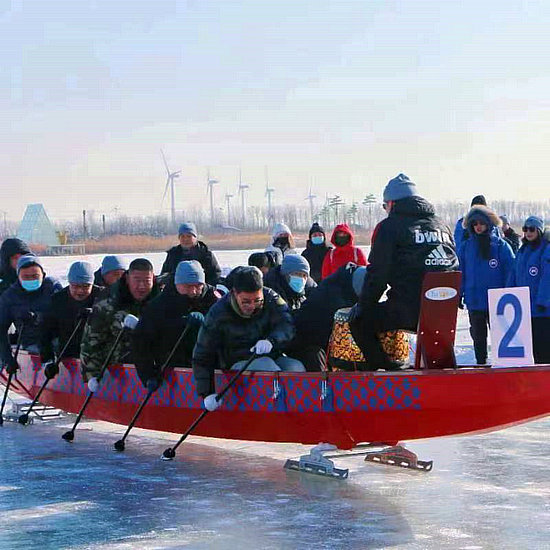 冰上龍舟賽也成了各地推出的特色活動。在黑龍江呼瑪縣,200多名參賽選手組成17支隊伍,在冰天雪地中上演“速度與激情”。冰上龍舟是傳統(tǒng)龍舟的創(chuàng)新和延伸。選手們用龍舟撐推動龍舟在冰上滑行,更具挑戰(zhàn)性和娛樂性。在遼寧錦州,第七屆海洋冰雪節(jié)暨全民冰雪運動季冰上龍舟超級聯(lián)賽將于1月15日至16日開賽。