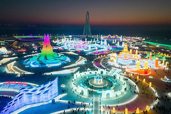 游客在哈爾濱冰雪大世界園區(qū)內(nèi)游玩(無人機照片,1月9日攝)。新華社記者 張濤 攝