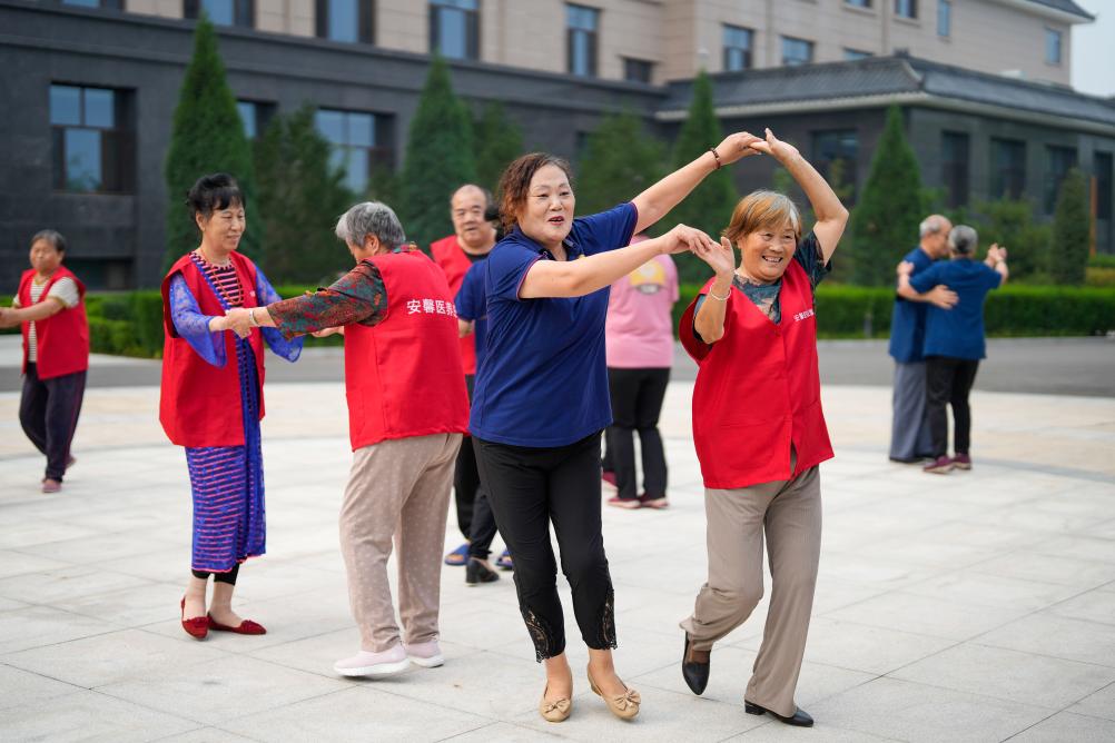 2023年9月12日,河北省唐山市古冶區(qū)一家養(yǎng)老機(jī)構(gòu)的老人們?cè)谠鹤永镞\(yùn)動(dòng)。新華社記者牟宇 攝