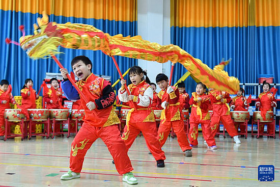 1月19日,山東省煙臺(tái)市福山區(qū)實(shí)驗(yàn)幼兒園的小朋友在進(jìn)行舞龍表演。