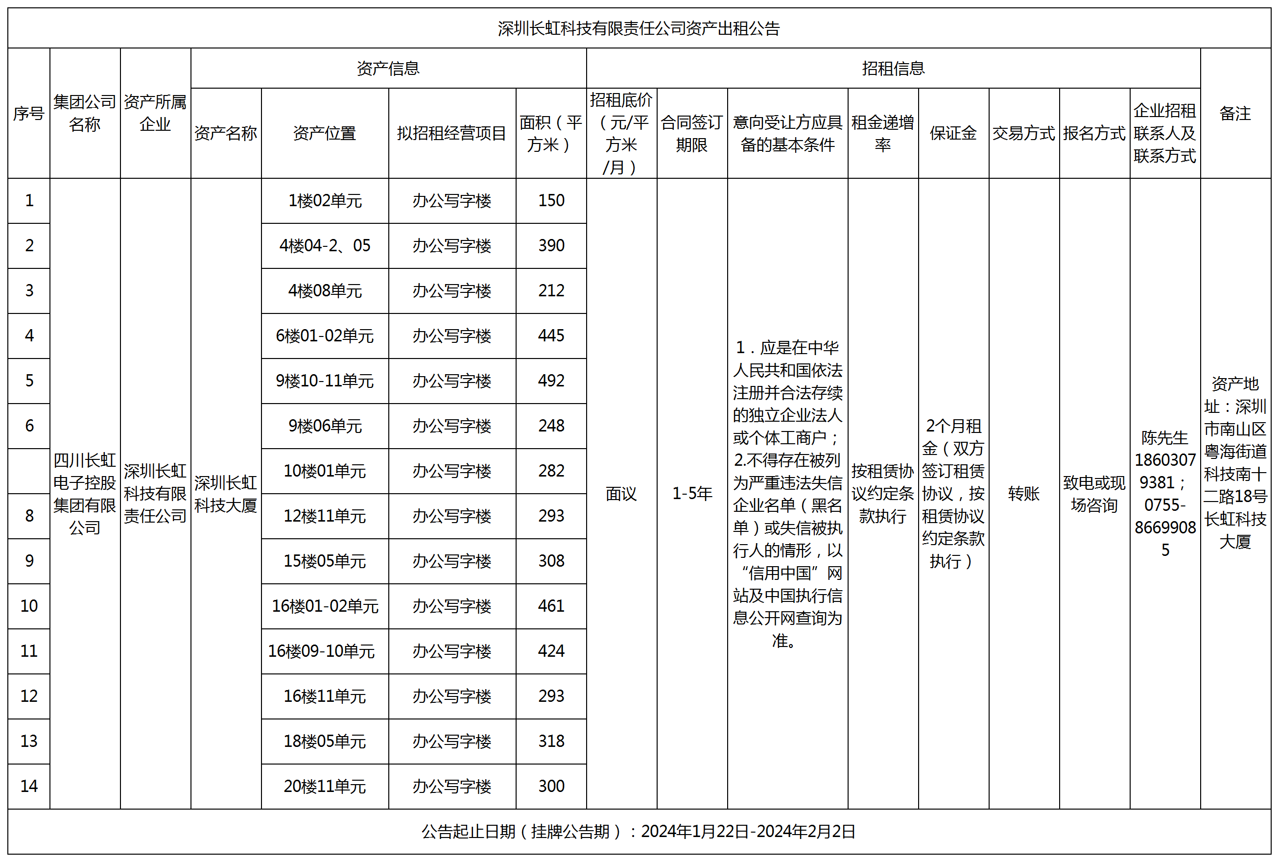 深圳長虹科技有限責(zé)任公司資產(chǎn)出租公告