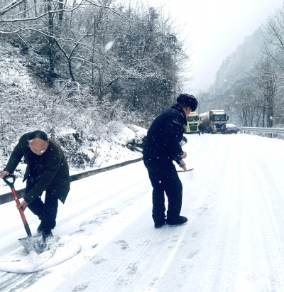 1月21日凌晨,平武境內(nèi)出現(xiàn)一輪明顯降雪過程,為保障道路交通安全。21日6時許,平武縣公安局白馬派出所聯(lián)合縣交警大隊、鄉(xiāng)政府、公路管理所組織村民對G247國道平武至九寨溝方向路段積雪進行了處理。過程中,民警對臨水、臨崖、橋梁、急彎、陡坡等易積雪、結(jié)冰路段,通過拋灑工業(yè)鹽、遠端設(shè)置臨時執(zhí)勤點勸返等措施強化路面管控。