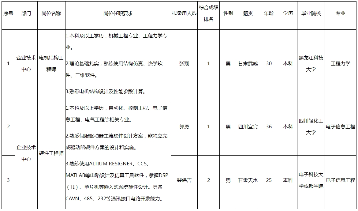 根據(jù)成都微精電機股份公司發(fā)布的招聘公告及招聘相關(guān)規(guī)定,經(jīng)筆試、面試、考察、體檢等程序,擬錄用張翔、郭勇等3名同志到成都微精電機股份公司工作,現(xiàn)予以公示,具體情況如下: