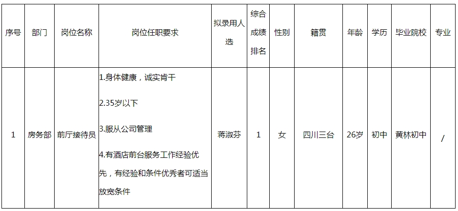根據(jù)四川梓樂文化旅游開發(fā)有限公司發(fā)布的招聘公告及招聘相關(guān)規(guī)定,經(jīng)面試、考察、體檢等程序,擬錄用蔣淑芬同志到梓州明宇麗雅酒店工作,現(xiàn)予以公示,具體情況如下: