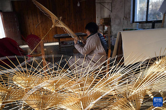 江西省婺源縣賦春鎮(zhèn)甲路村的工匠在制作甲路紙傘的傘骨(1月10日攝)。