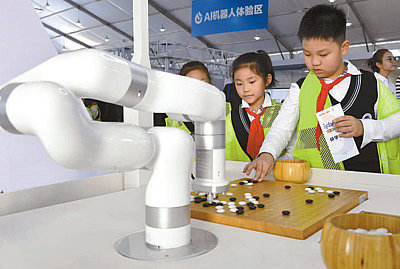 安徽合肥市蜀山區(qū)合肥體育中心,孩子們在和AI機(jī)器人對弈。陳三虎攝