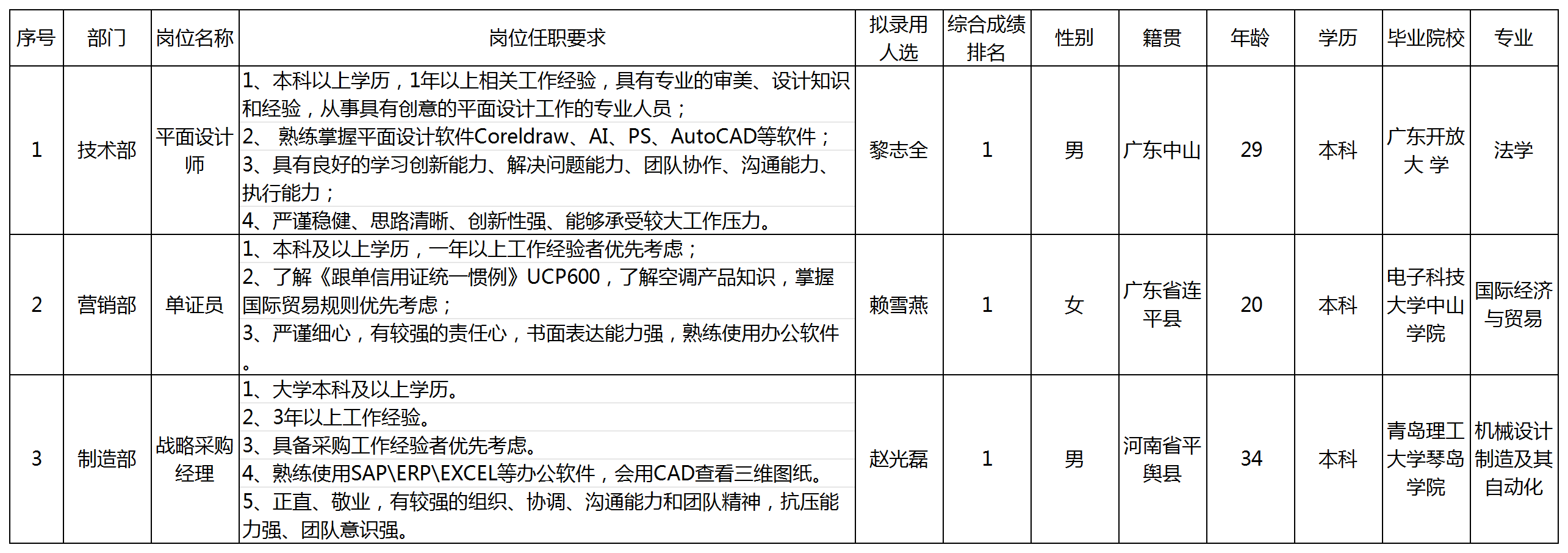 根據(jù)中山長虹電器有限公司發(fā)布的招聘公告及招聘相關(guān)規(guī)定,經(jīng)面試、考察、體檢等程序,擬錄用黎志全同志到平面設(shè)計師崗位工作,賴雪燕同志到單證員崗位工作,趙光磊同志到戰(zhàn)略采購經(jīng)理崗位工作?,F(xiàn)予以公示,具體情況如下: