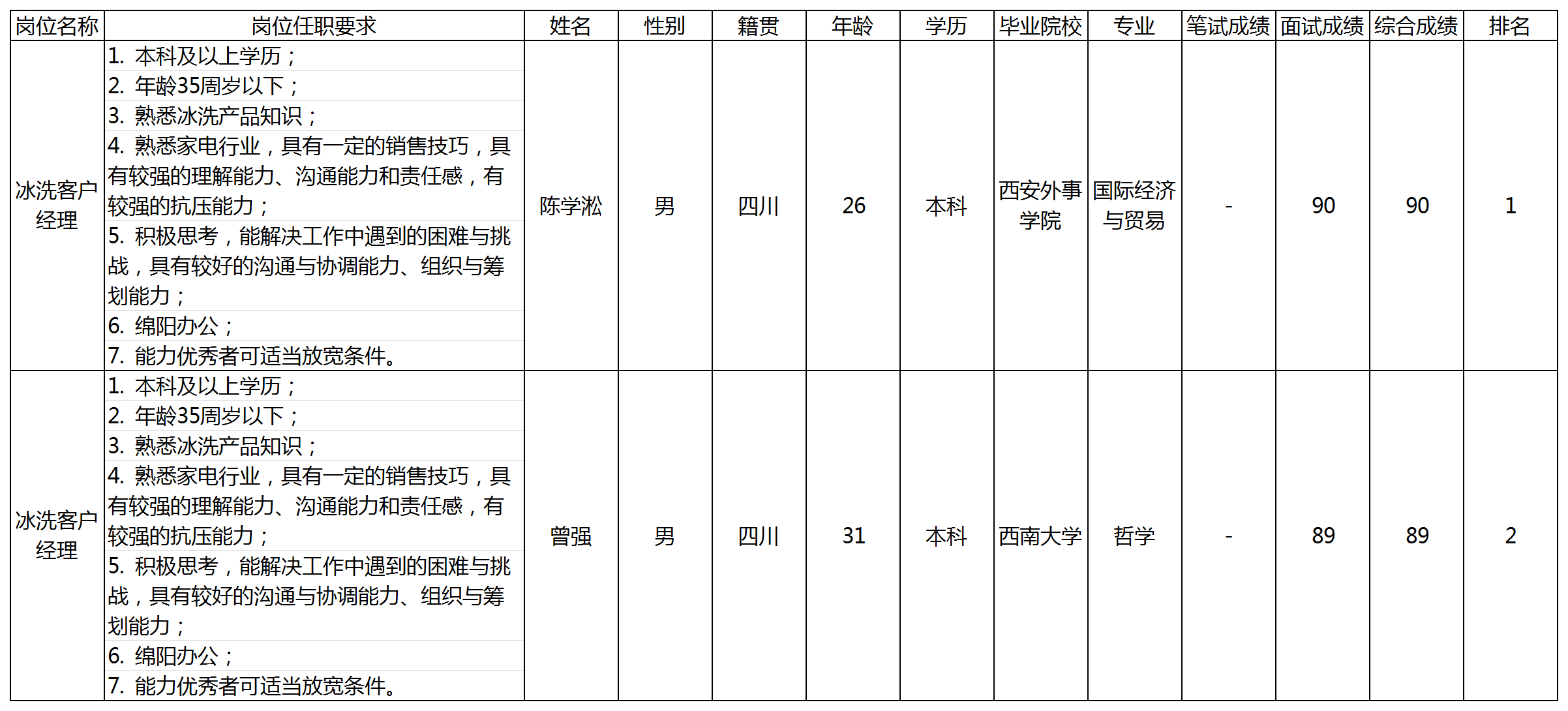 根據四川智易家網絡科技有限公司(長虹·美菱中國區(qū))發(fā)布的招聘公告及招聘相關規(guī)定,經初試、復試等程序,現(xiàn)將面試成績予以公示。