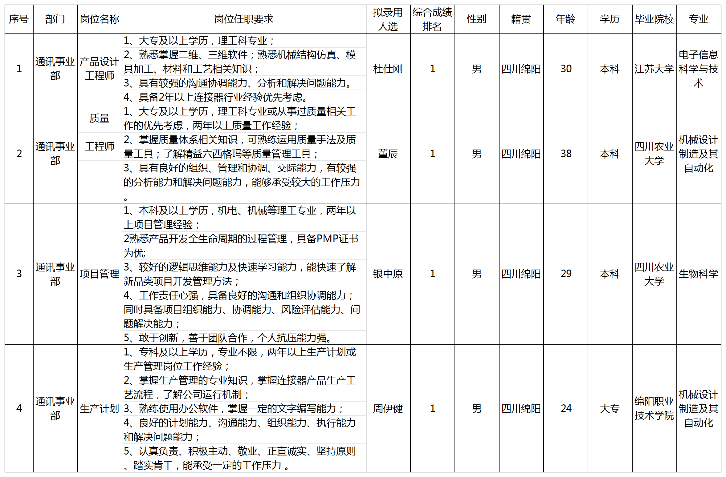 根據(jù)四川華豐科技股份公司發(fā)布的招聘公告及招聘相關(guān)規(guī)定,經(jīng)筆試、面試、考察、體檢等程序,擬錄用杜仕剛等同志到四川華豐科技股份有限公司工作,現(xiàn)予以公示,具體情況如下: