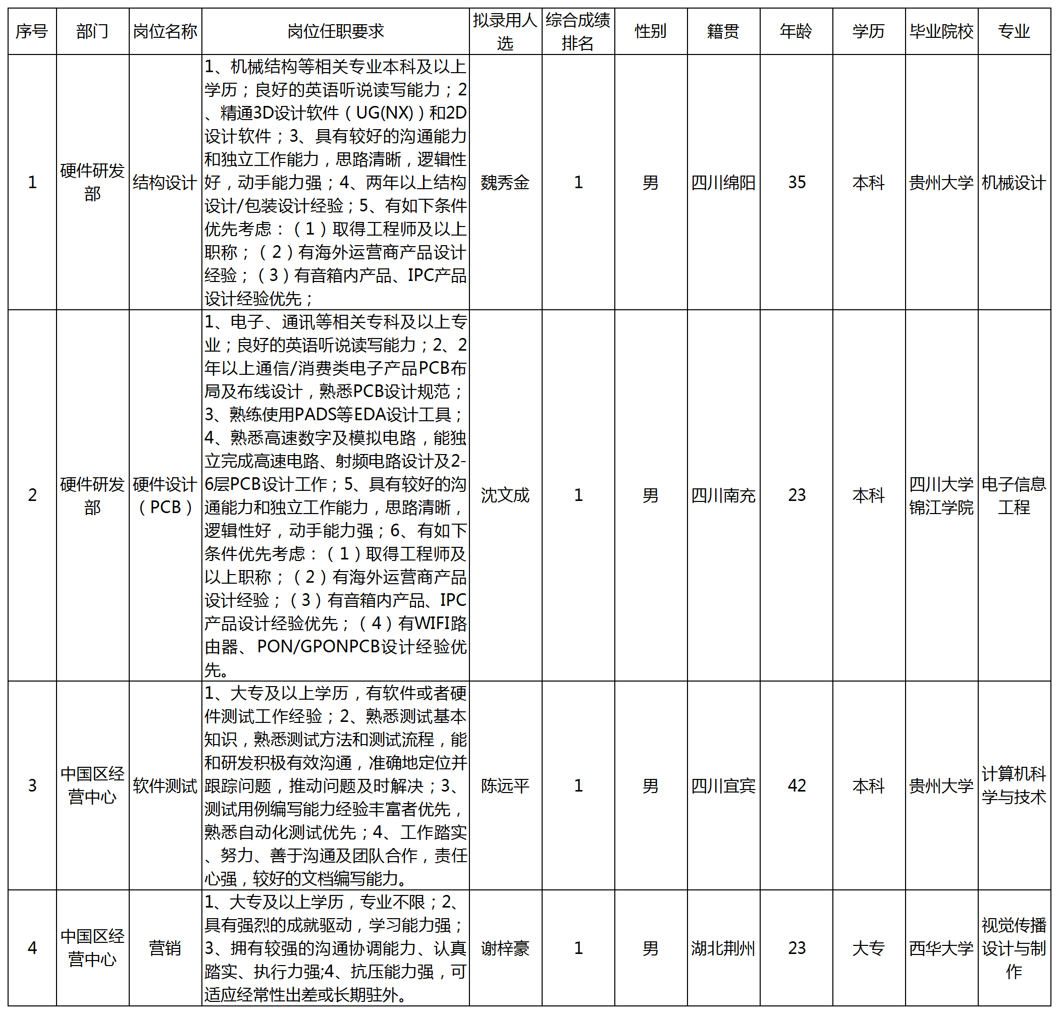 根據(jù)四川長虹網(wǎng)絡科技有限責任公司發(fā)布的招聘公告及招聘相關規(guī)定,經筆試、面試、考察、體檢等程序,擬錄用魏秀金等同志四川長虹網(wǎng)絡科技有限責任公司工作,現(xiàn)予以公示,具體情況如下: