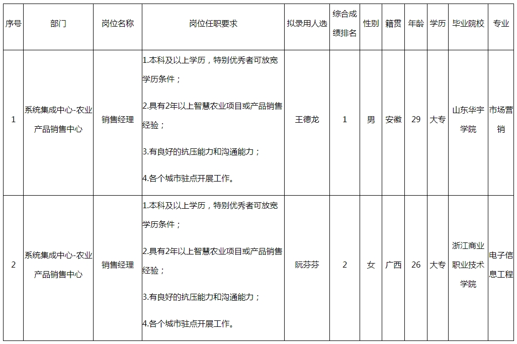 根據(jù)四川長虹云數(shù)信息技術(shù)有限公司發(fā)布的招聘公告及招聘相關(guān)規(guī)定,經(jīng)面試程序,擬錄用王德龍、阮芬芬同志到四川長虹云數(shù)信息技術(shù)有限公司工作,現(xiàn)予以公示,具體情況如下: