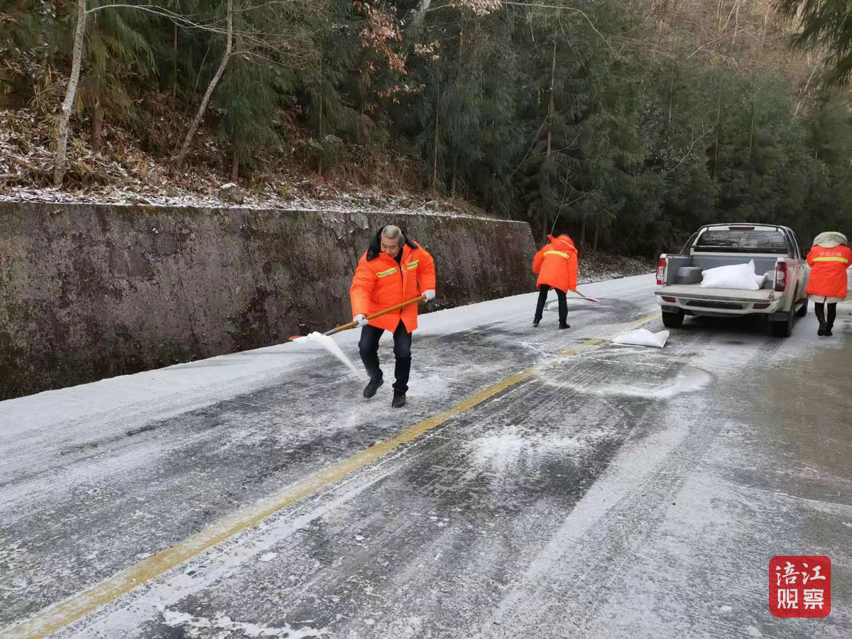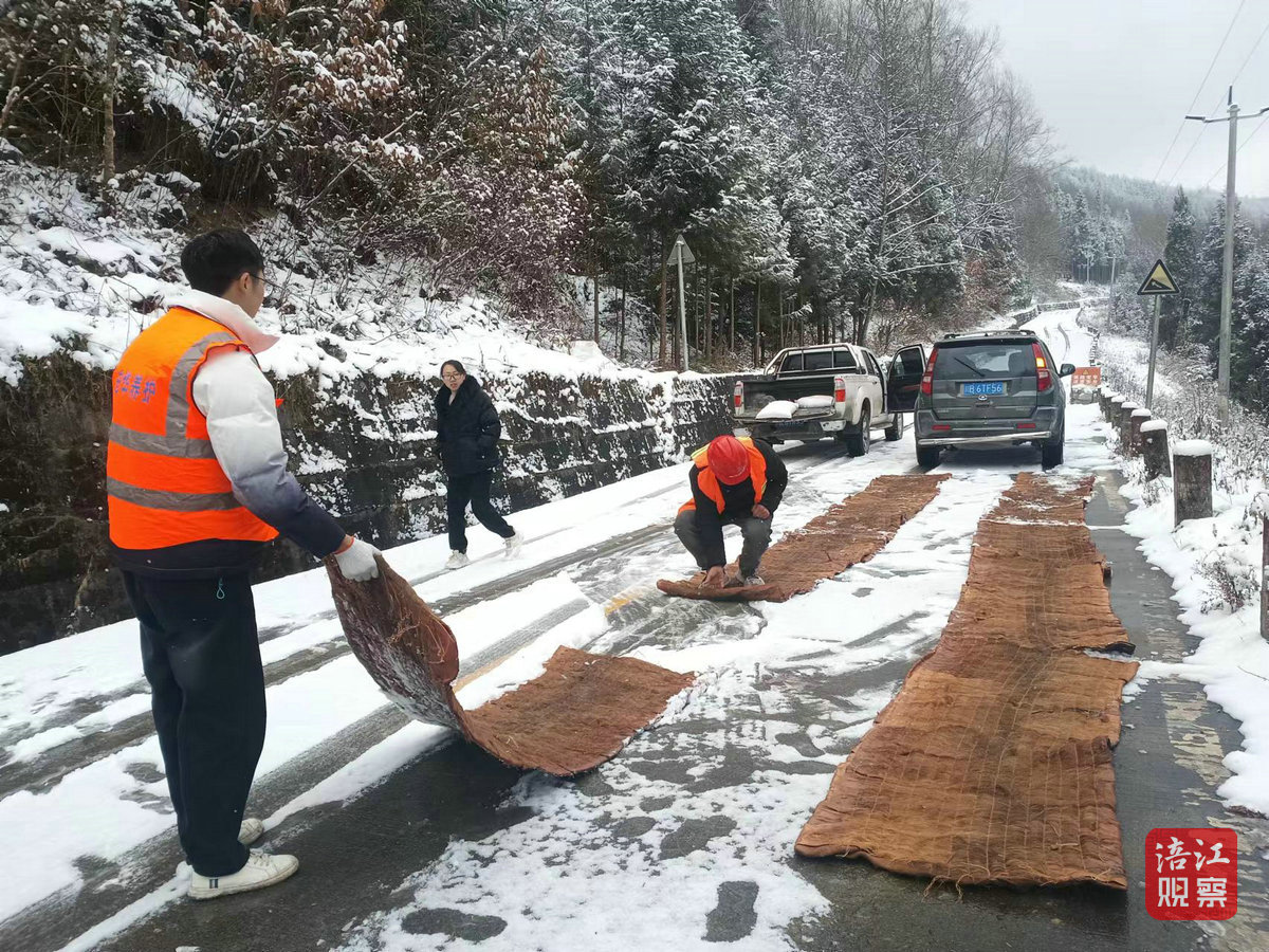 1月24日上午,在北川都貫-開坪公路上,公路養(yǎng)護人員為道路危險易滑路段撒融雪劑、鋪設(shè)防滑棕墊、設(shè)置交通標志牌,與交警一同勸返車輛。