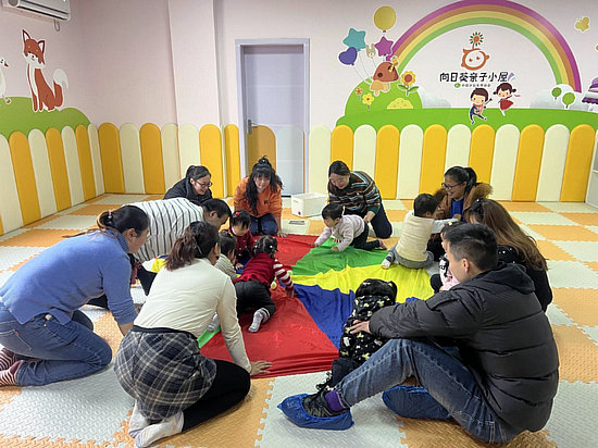 2024年1月13日,重慶市江北區(qū)魚嘴鎮(zhèn)“向日葵親子小屋”“趣玩彩虹傘”親子課堂開課。中國計(jì)生協(xié)供圖