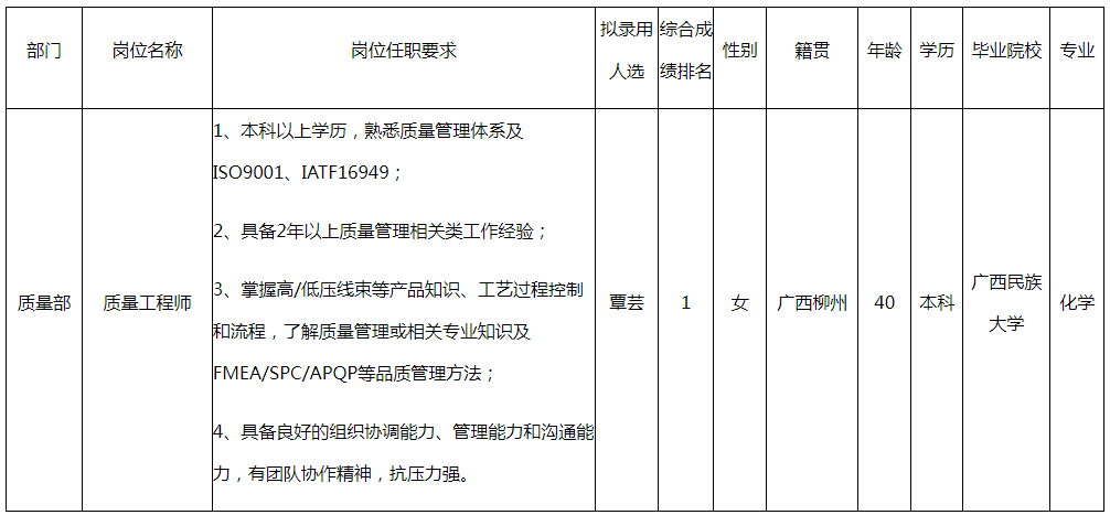 根據(jù)柳州華豐科技有限公司發(fā)布的招聘公告及招聘相關(guān)規(guī)定,經(jīng)筆試、面試、考察、體檢等程序,擬錄用覃蕓同志到柳州華豐科技有限公司工作,現(xiàn)予以公示,具體情況如下: