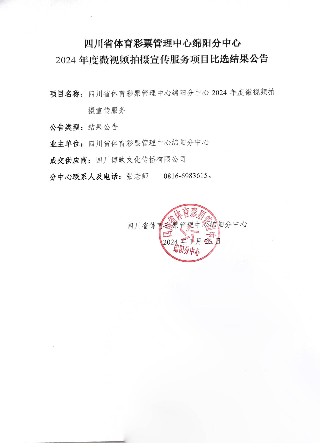 四川省體育彩票管理中心綿陽分中心2024年度微視頻拍攝宣傳服務(wù)項(xiàng)目比選結(jié)果公告