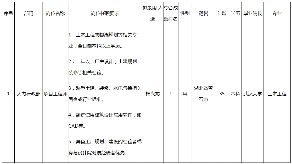 根據(jù)四川波鴻實業(yè)有限公司發(fā)布的招聘公告及招聘相關(guān)規(guī)定,經(jīng)面試、體檢等程序,擬錄用楊興龍為威斯卡特工業(yè)(中國)有限公司項目工程師,現(xiàn)予以公示,具體情況如下: