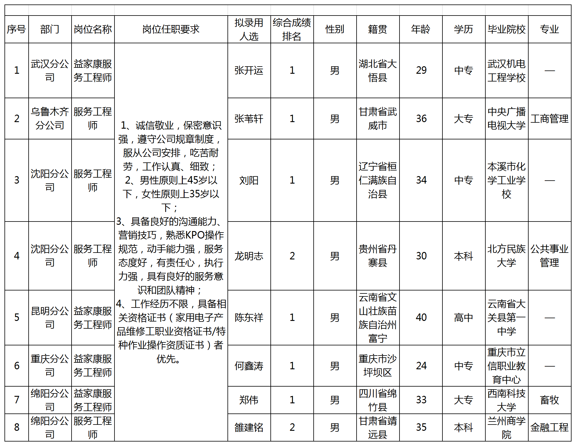 根據(jù)四川快益點(diǎn)電器服務(wù)連鎖有限公司發(fā)布的招聘公告及招聘相關(guān)規(guī)定,經(jīng)面試、體檢等程序,擬錄用以下同志到四川快益點(diǎn)電器服務(wù)連鎖有限公司工作,現(xiàn)予以公示,具體情況如下: