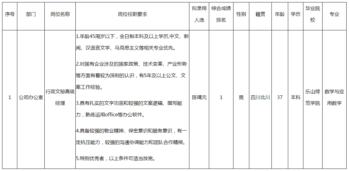 根據(jù)長虹控股集團發(fā)布的招聘公告及招聘相關(guān)規(guī)定,經(jīng)筆試、面試、考察、體檢等程序,擬錄用陳靖元同志到行政文秘高級經(jīng)理崗位工作,現(xiàn)予以公示,具體情況如下: