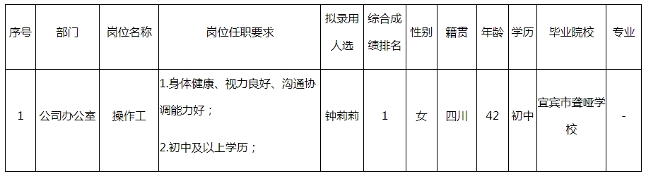 根據(jù)宜賓紅星電子有限公司發(fā)布的招聘公告及招聘相關(guān)規(guī)定,經(jīng)面試、體檢程序,擬錄用鐘莉莉同志到宜賓紅星電子有限公司工作,現(xiàn)予以公示,具體情況如下: