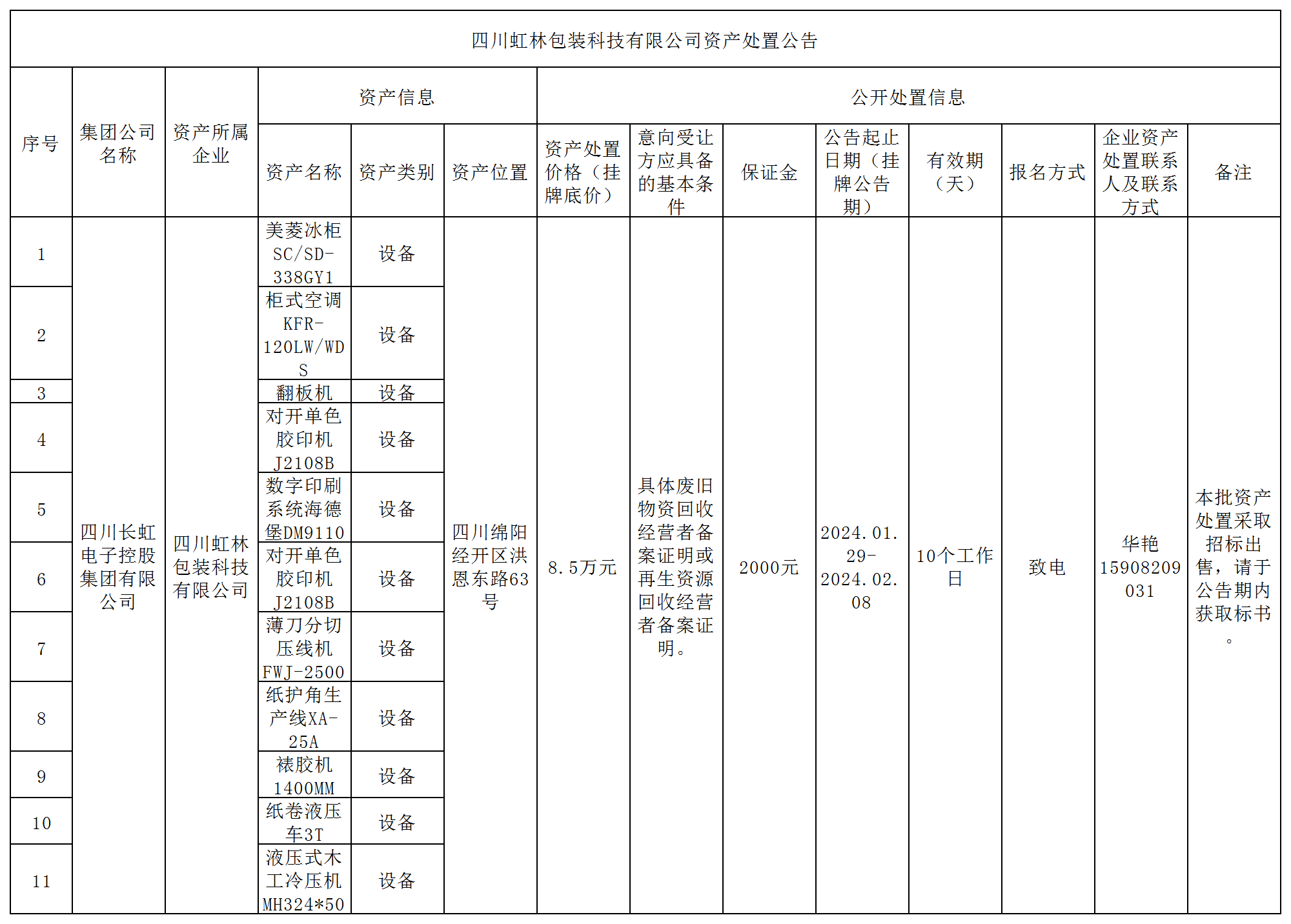 四川虹林包裝科技有限公司資產(chǎn)處置公告