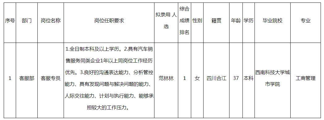 根據(jù)四川波鴻實(shí)業(yè)有限公司發(fā)布的招聘公告及招聘相關(guān)規(guī)定,經(jīng)面試、體檢等程序,擬錄范林林為綿陽(yáng)市平昌汽車(chē)銷(xiāo)售服務(wù)有限公司客服專(zhuān)員,現(xiàn)予以公示,具體情況如下: