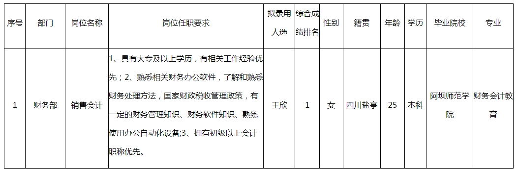 根據(jù)格潤中天公司發(fā)布的招聘公告及招聘相關(guān)規(guī)定,經(jīng)面試、體檢等程序,擬錄用王欣同志到格潤中天財務部工作,現(xiàn)予以公示,具體情況如下: