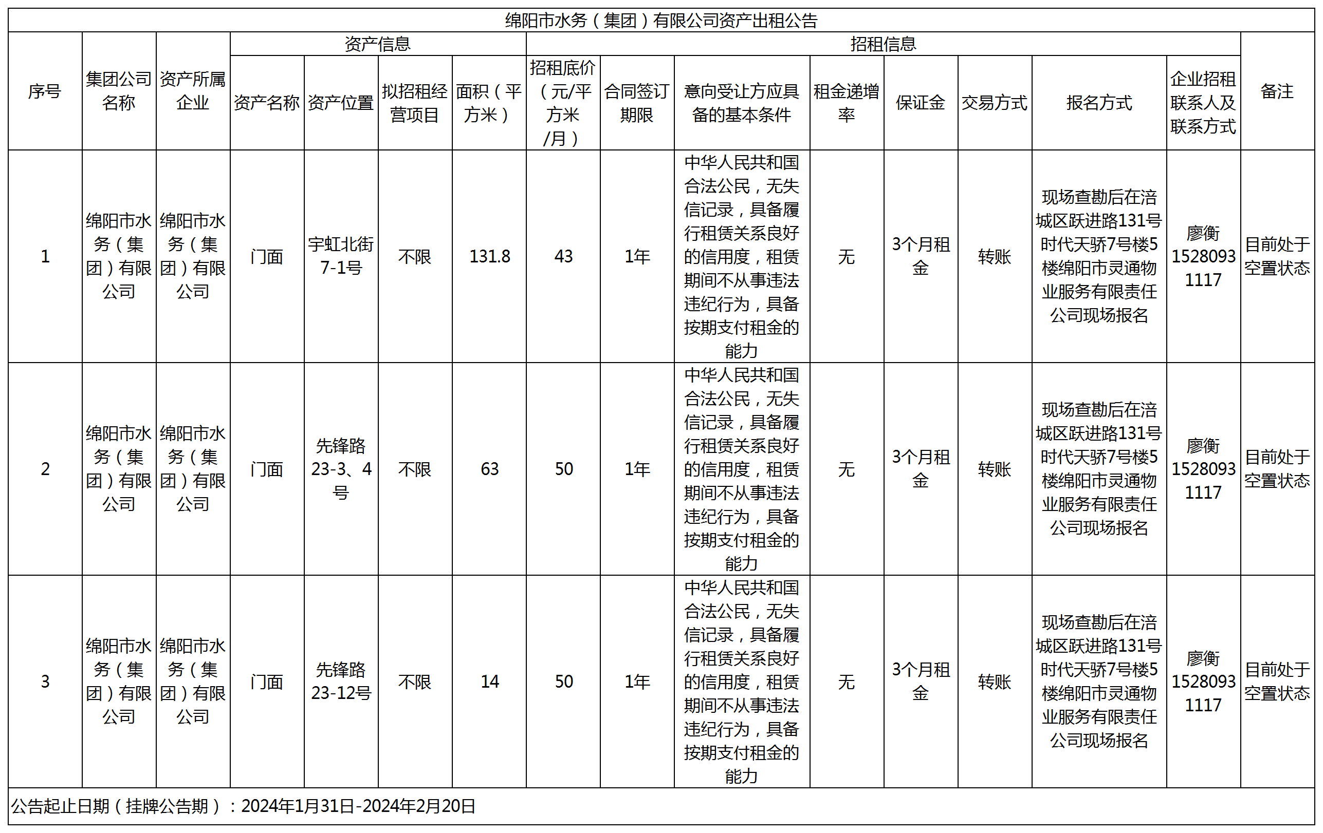 綿陽市水務(wù)(集團)有限公司資產(chǎn)出租公告