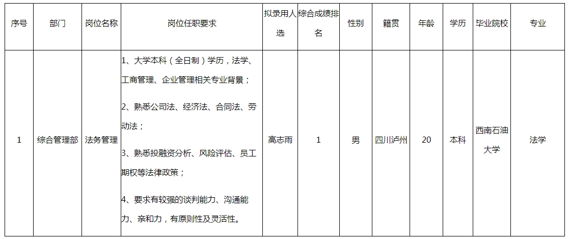 根據(jù)成都微精電機(jī)股份公司發(fā)布的招聘公告及招聘相關(guān)規(guī)定,經(jīng)面試、考察、體檢等程序,擬錄用高志雨同志到成都微精電機(jī)股份公司工作,現(xiàn)予以公示,具體情況如下: