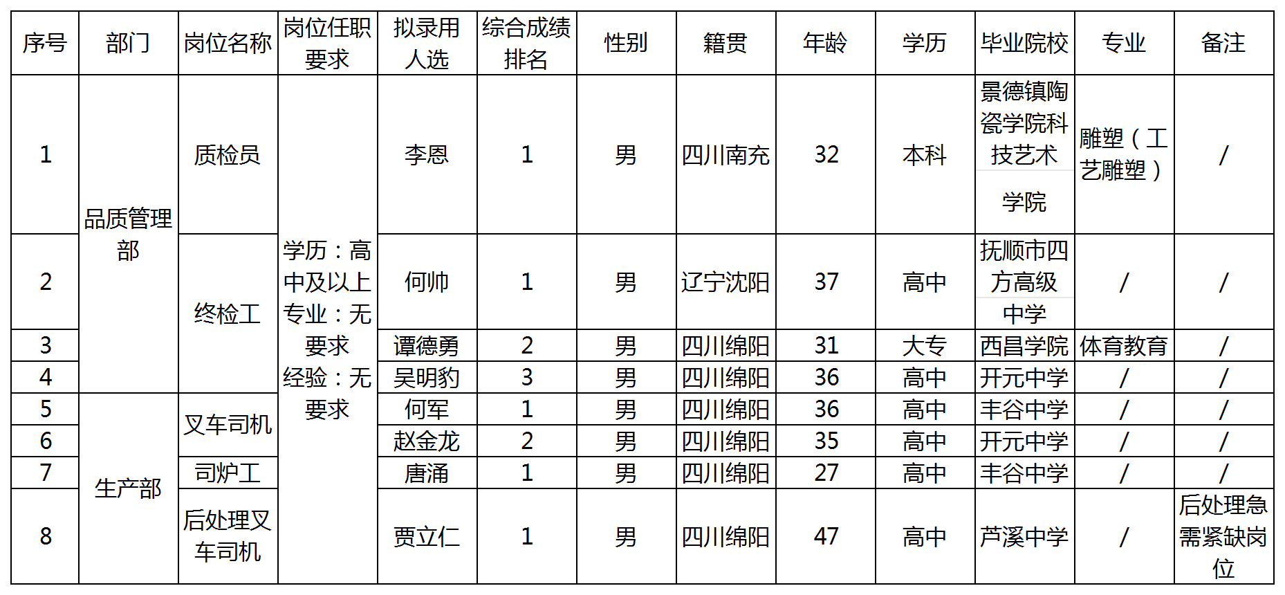 根據(jù)四川波鴻實(shí)業(yè)有限公司發(fā)布的招聘公告及招聘相關(guān)規(guī)定,經(jīng)面試,擬錄用以下人員到四川綿陽(yáng)好圣汽車零部件制造有限公司一線工作,現(xiàn)予以公示,具體情況如下: